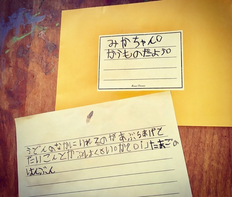 後で「みかちゃんにこの紙あげる!この紙があったらみかちゃんも煮込みうどん作れるからね」と言ってプレゼントしてくれました。(メニューは煮込みうどん)優しい心が育っていますね。