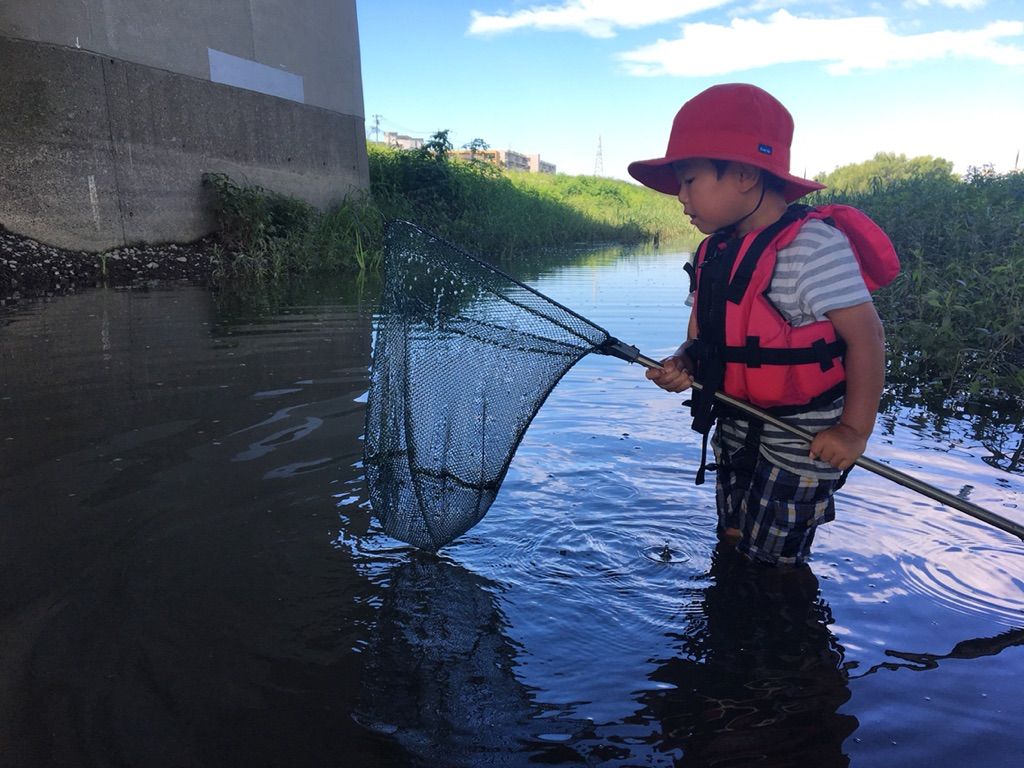 お兄ちゃんが網で魚を取っては自分も網を持って挑戦をしてみたり