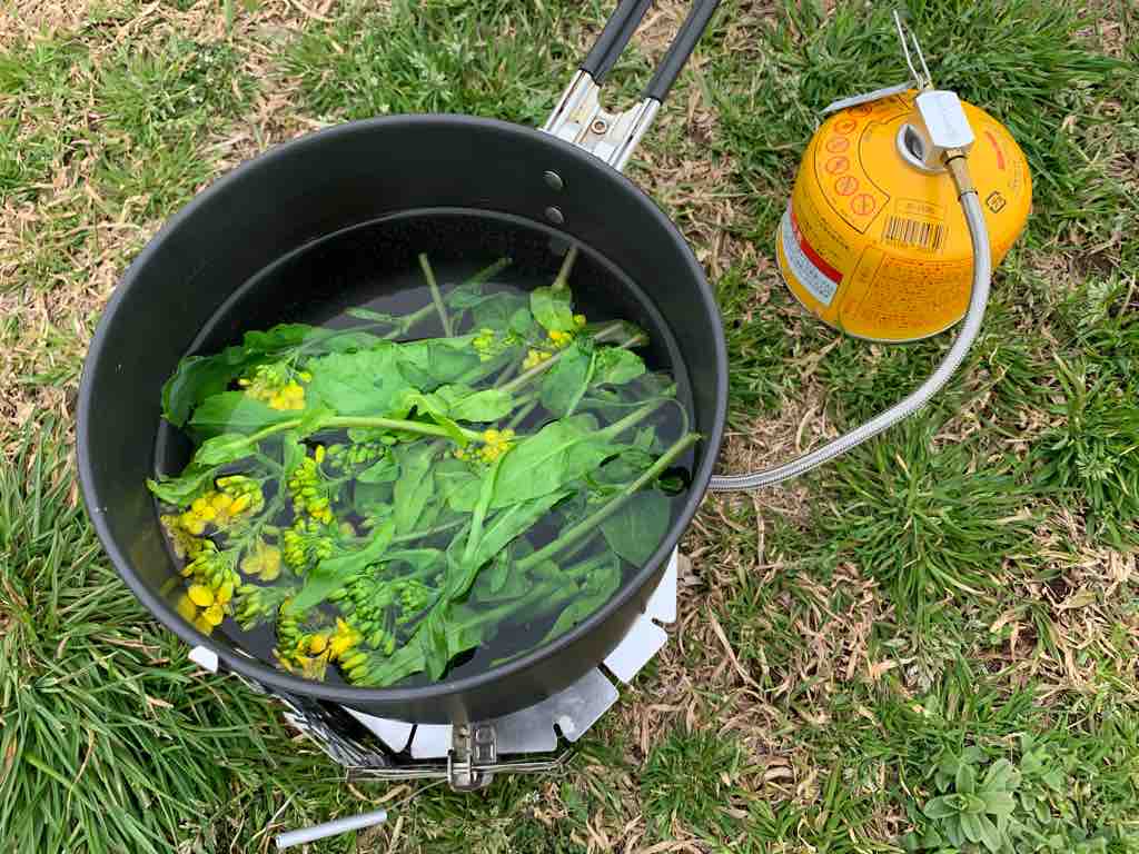 菜の花は水道で洗って、ワンバーナーでお湯を沸かし茹でました。