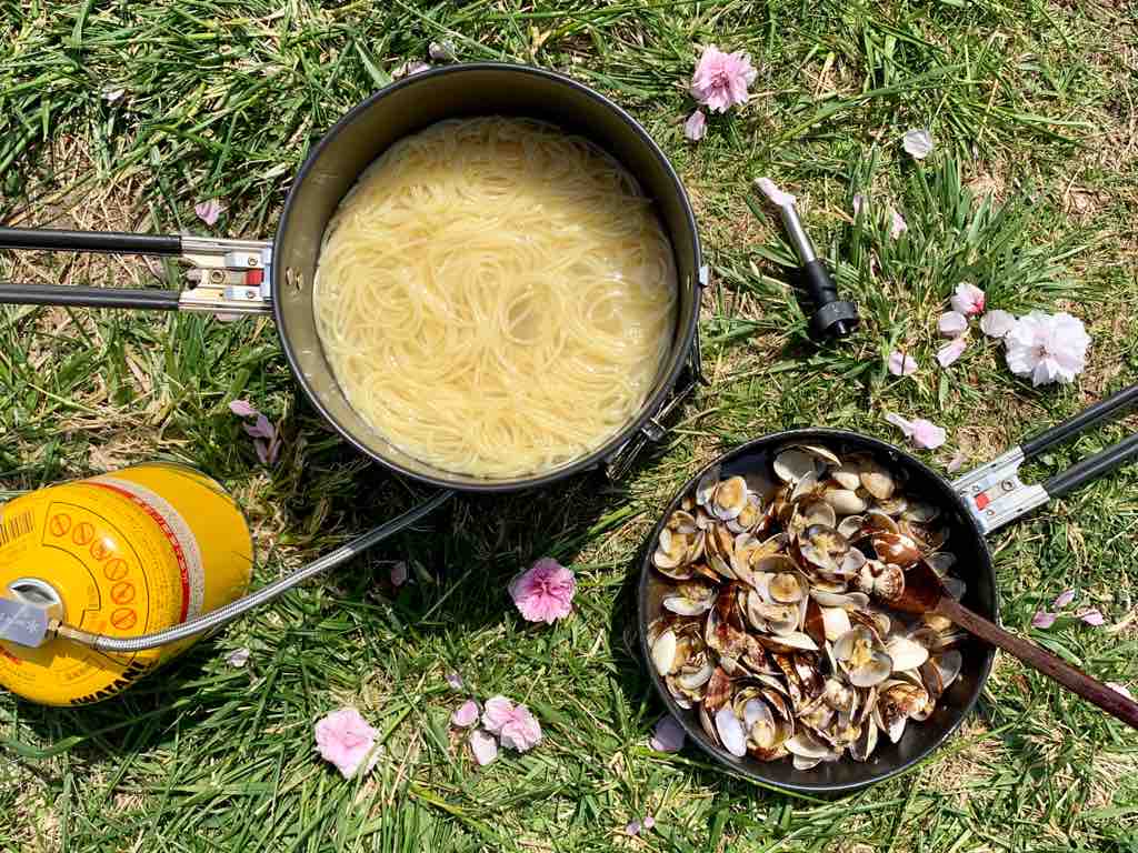 アサリが新鮮なうちに次の日に採ったアサリでアサリのパスタをアウトドア・クッキングしました♪
