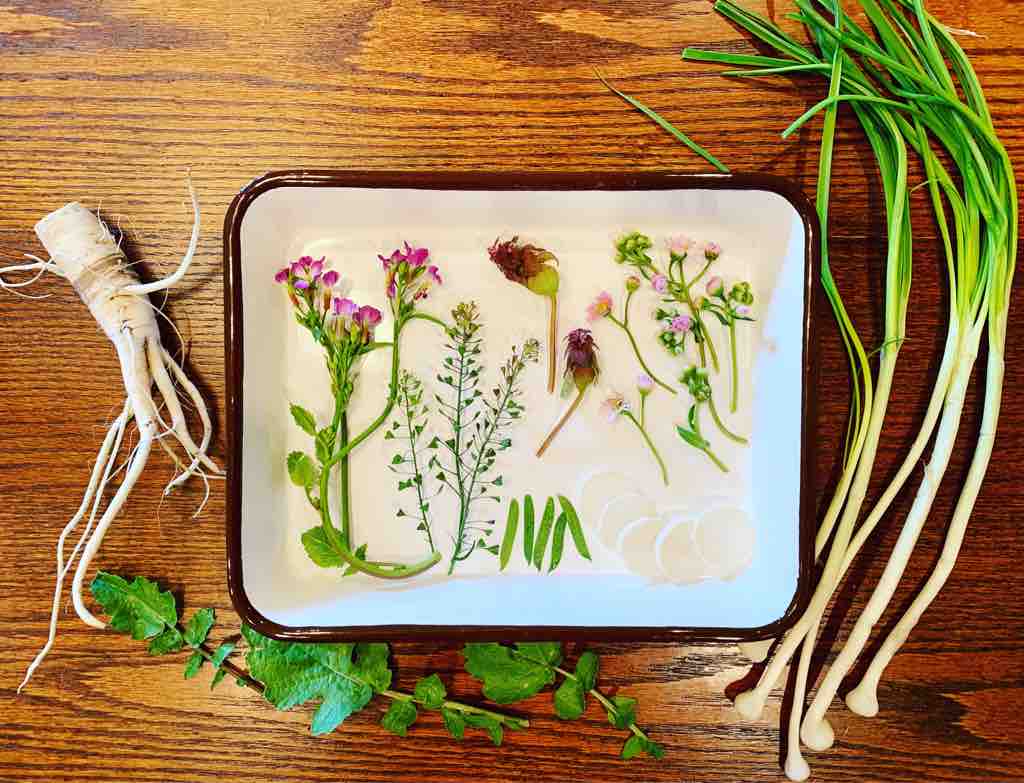 ・ノビル・ノビルの葉・ヒメオドリコソウ・ナズナ・ハルジオン・ハマダイコンの根と花と葉・カラスノエンドウの実(豆)